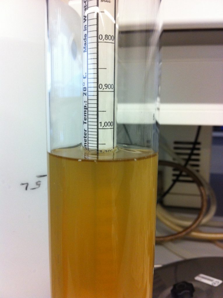 Coloque o mosto ou a cerveja dentro de uma proveta, com um volume suficiente para que o densímetro não toque ao fundo. Insira o densímetro e verifique a densidade na escala, no ponto onde separa o líquido do ar. No exemplo da foto ao lado, o mosto continha densidade de 1,070.